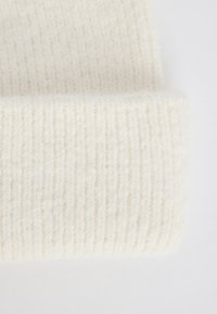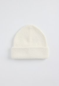 White wool beanie with ribbed texture, paired with a green and cream striped scarf. Model has short hair and gold hoop earrings.