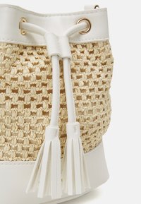 Woven bucket bag with a beige straw texture, white leather accents, tassel detail, and a shoulder strap. Gold hardware visible.