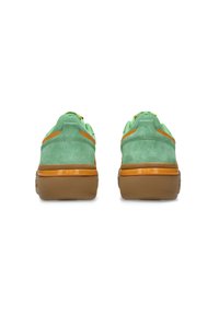 Low-top sneaker in green suede with orange stripes and lace-up design, featuring a thick brown rubber sole for casual wear.
