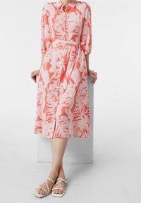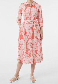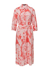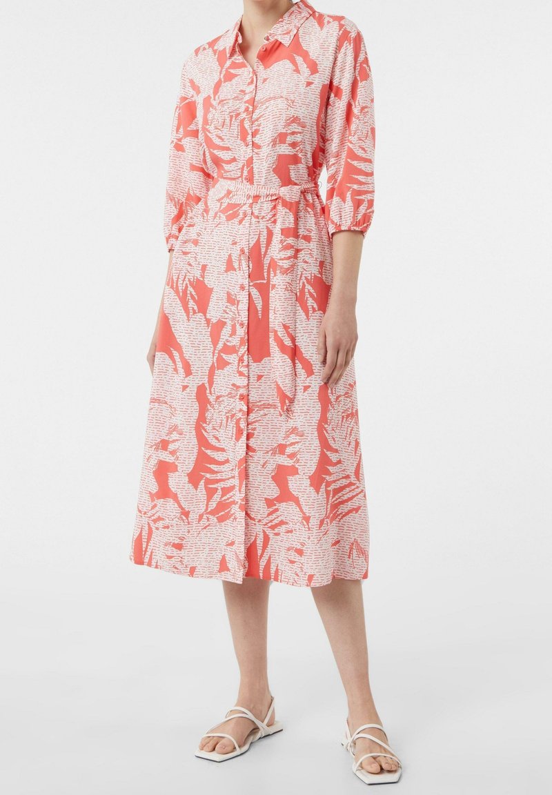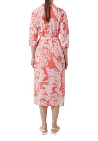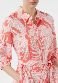 Coral dress with 3/4 sleeves, button front, and waist tie. Features a white floral and text pattern, midi length, and soft fabric.