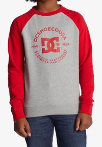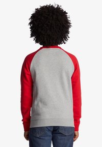 Gray sweatshirt with red sleeves, logo in center, ribbed cuffs and hem, paired with blue jeans and black sneakers. Casual, sporty design.