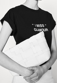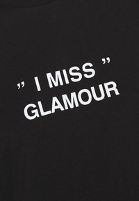 Black t-shirt with rolled short sleeves, featuring white text, "I MISS GLAMOUR," centered on the front. Cotton fabric, relaxed fit.