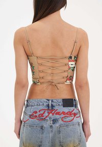 The Love Kills Corset top features layers of Ed's full-colour graphics capturing his legendary creative rebellion.