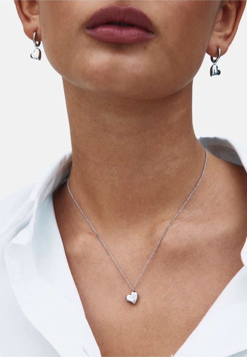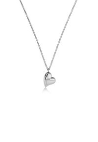 The Amorina line offers a playful and soft heart shape. Seen here in a longer necklace in shiny stainless steel, with a chain that sweeps through the heart charm fastening. A loving gift for that special someone.