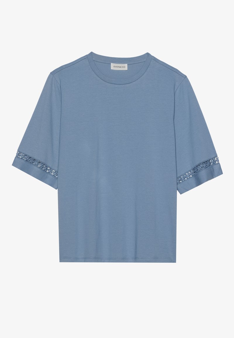Light blue short-sleeve t-shirt with lace detail on cuffs, soft fabric, crew neck, relaxed fit, and no visible logos or patterns.