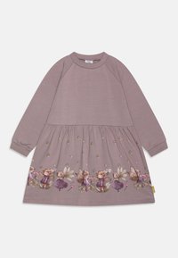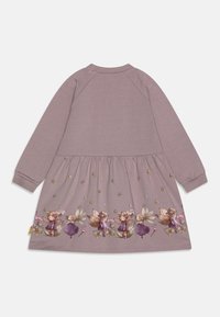 Long-sleeve dress in soft lavender fabric, featuring a gathered skirt and printed fairy illustrations at the hem with floral accents.