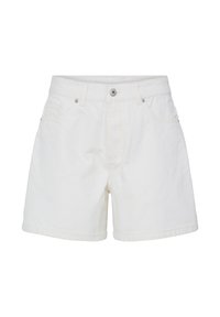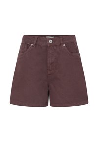 Denim shorts in light blue with a frayed hem, featuring a classic five-pocket design and belt loops. Paired with brown loafers and white socks.