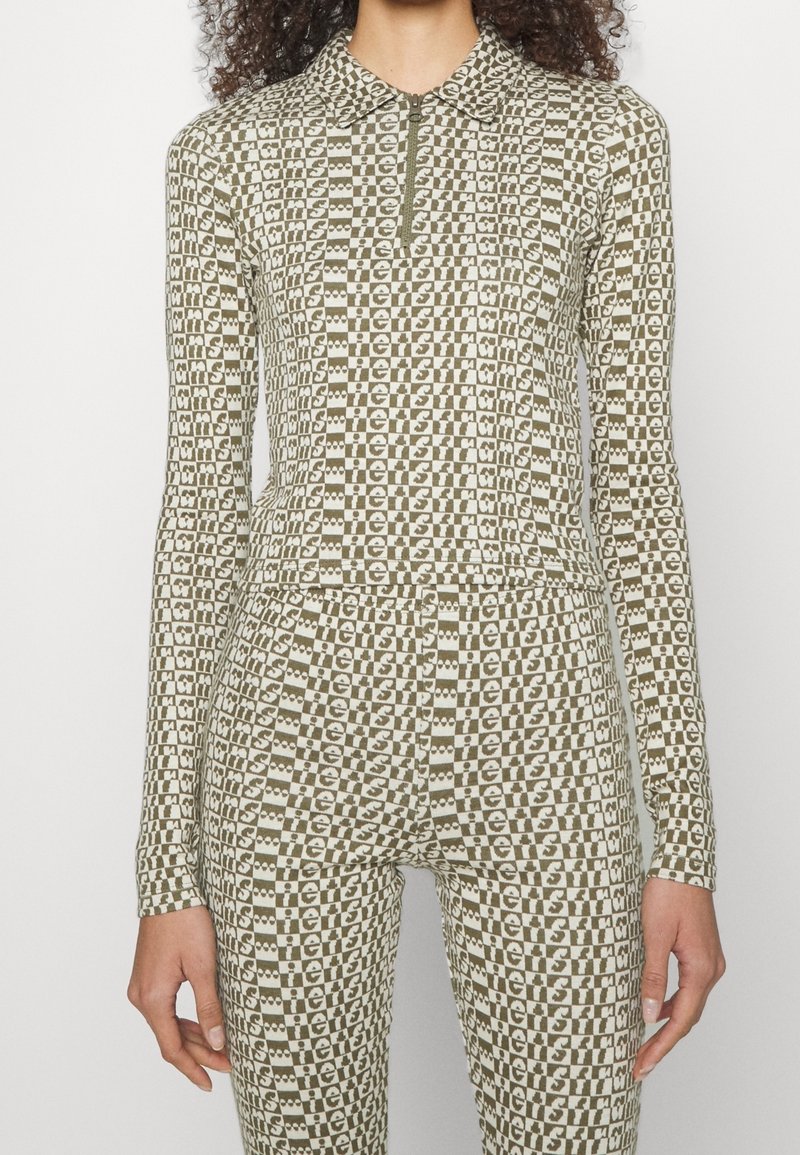 Long-sleeved, fitted top and bottom set in olive green with a repeated text pattern, zip collar, and smooth fabric texture.
