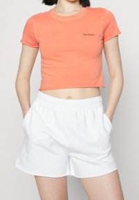 Orange cropped tank top made of soft fabric, featuring a round neckline and small black text. Paired with light beige sweatpants.