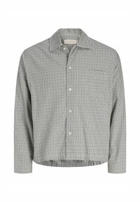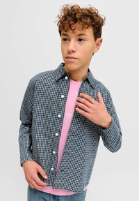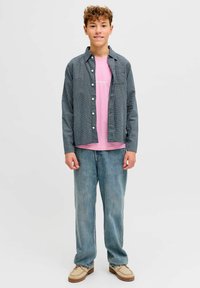 Checked button-up shirt in navy and white, worn over a light pink t-shirt; paired with light blue denim jeans and beige shoes.