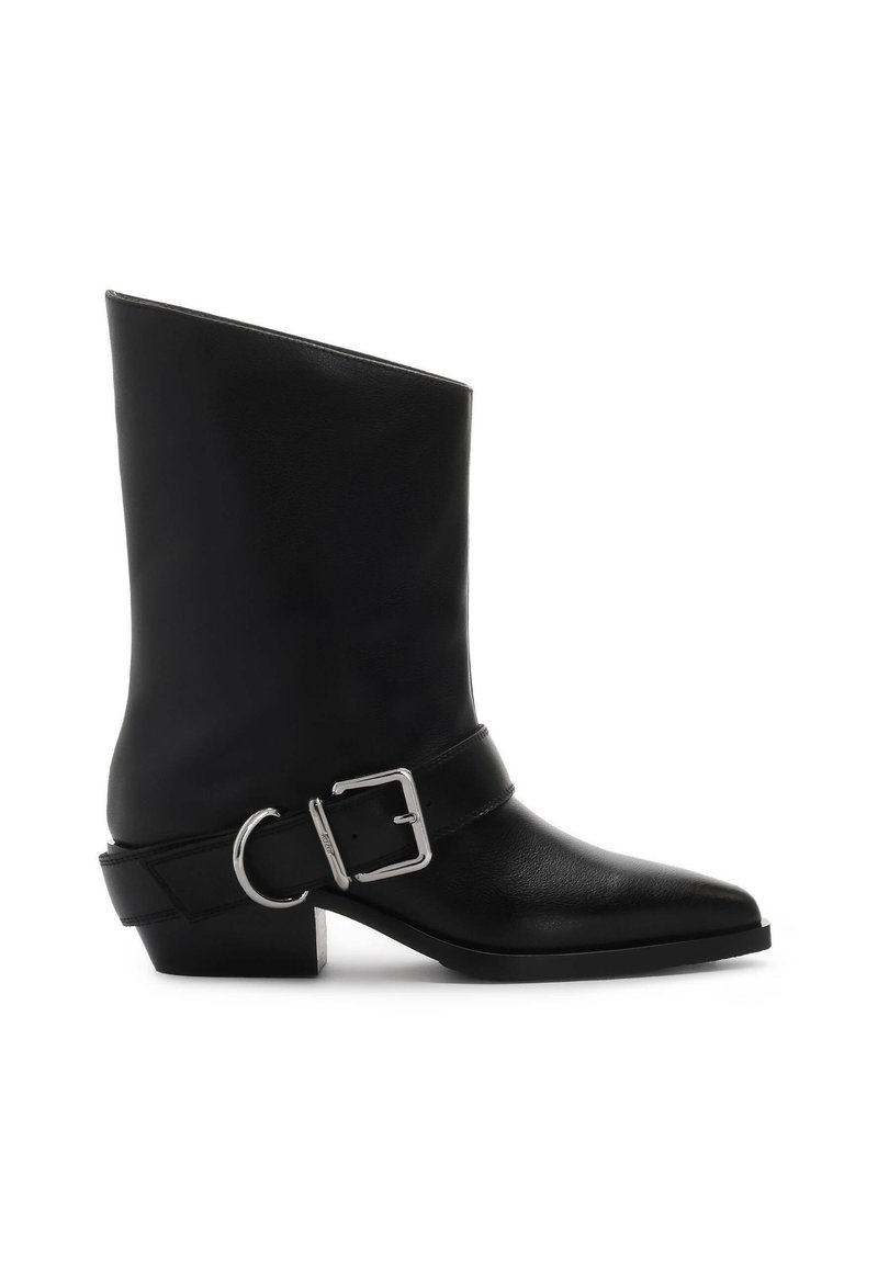Cowboy-styleboots made of high-quality blacknatural leather with a smooth finish. The slip-on model, without a clasp, is characterized by a simple upper reaching to the middle of the calf and a rounded nose with a slightly elongated shape, typical of the western cut. A decorative belt wrapping around the lower part of the upper catches the eye thanks to a massive silver buckle, adding character and distinction to the shoes. Stable, medium-height stiletto heel provides a comfortable fit and works well for everyday wear. This is the perfect choice for people who are looking for boots with a distinctive style, combining classic elegance with a touch of rock claw.