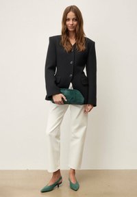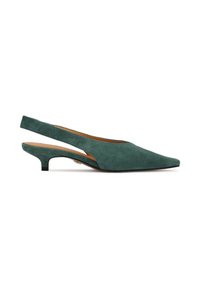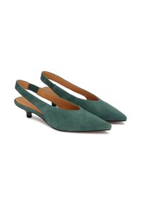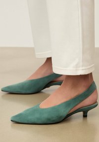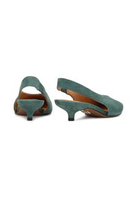 Sensually shaped pumps made of soft suede in a unique green-turquoise shade bring a touch of elegant freshness to styling. The minimalist upper with a smooth line subtly slims the foot, and the open heel adds lightness and feminine character. The low ducktail heel provides everyday comfort while maintaining a sophisticated look. An elastic insert on the heel support strap guarantees a perfect fit and comfort. This is an excellent choice for women who appreciate the harmony between Classic elegance and modern subtlety.