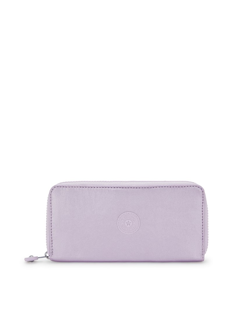 Purple fabric wallet with a smooth texture, rectangular shape, zip closure, and circular logo detail on the front.