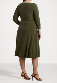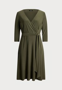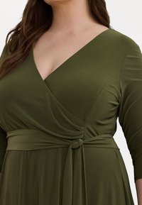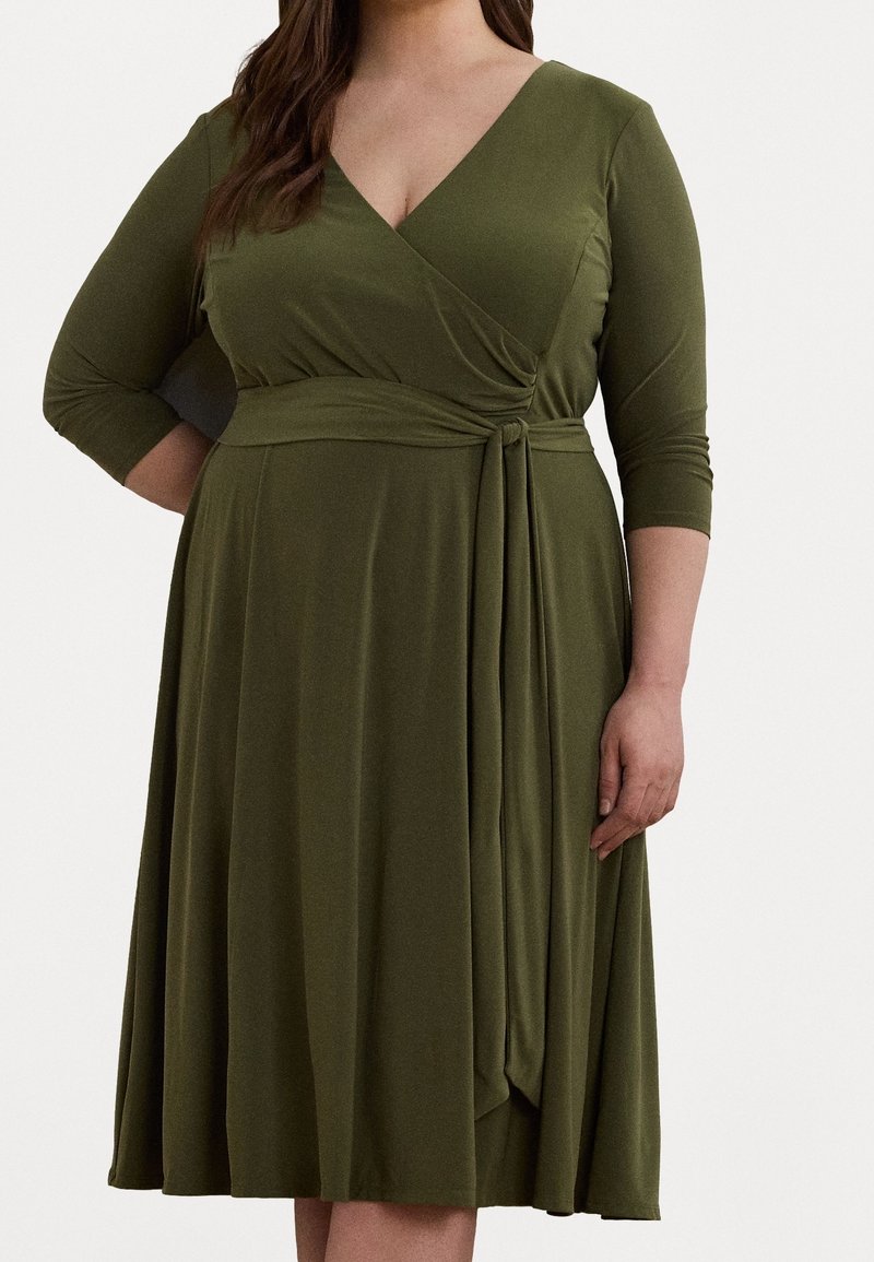 Woman wearing olive green wrap dress with three-quarter sleeves and tied waist belt, standing against a plain background.