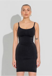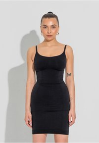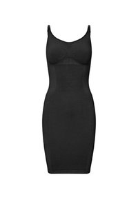 When applying shapewear - ALWAYS put the product on from below - also with this slip dress. Preferably sit down on a chair and put on the product with your feet first, one leg at a time, pull the product up over knees and thighs, and then pull up with the same care as when putting on nylon stockings. Once you have the product on, you can adjust the bust and buttocks under the shapewear for the right comfort and support.
