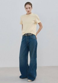 Woman with hair tied back wears light yellow short-sleeve top, black studded belt, wide-leg blue jeans, and white shoes, standing against plain backdrop.