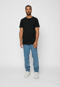 Man standing, wearing a black short-sleeve t-shirt, blue patchwork jeans, and white sneakers against a plain light background.