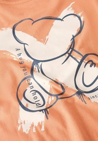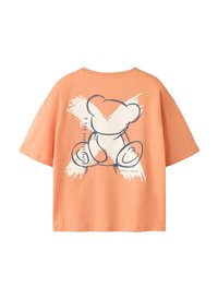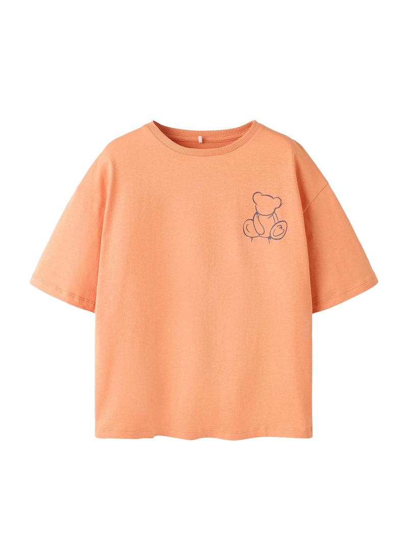 Peach short-sleeve T-shirt with a simple dark line drawing of a teddy bear on the upper left chest.