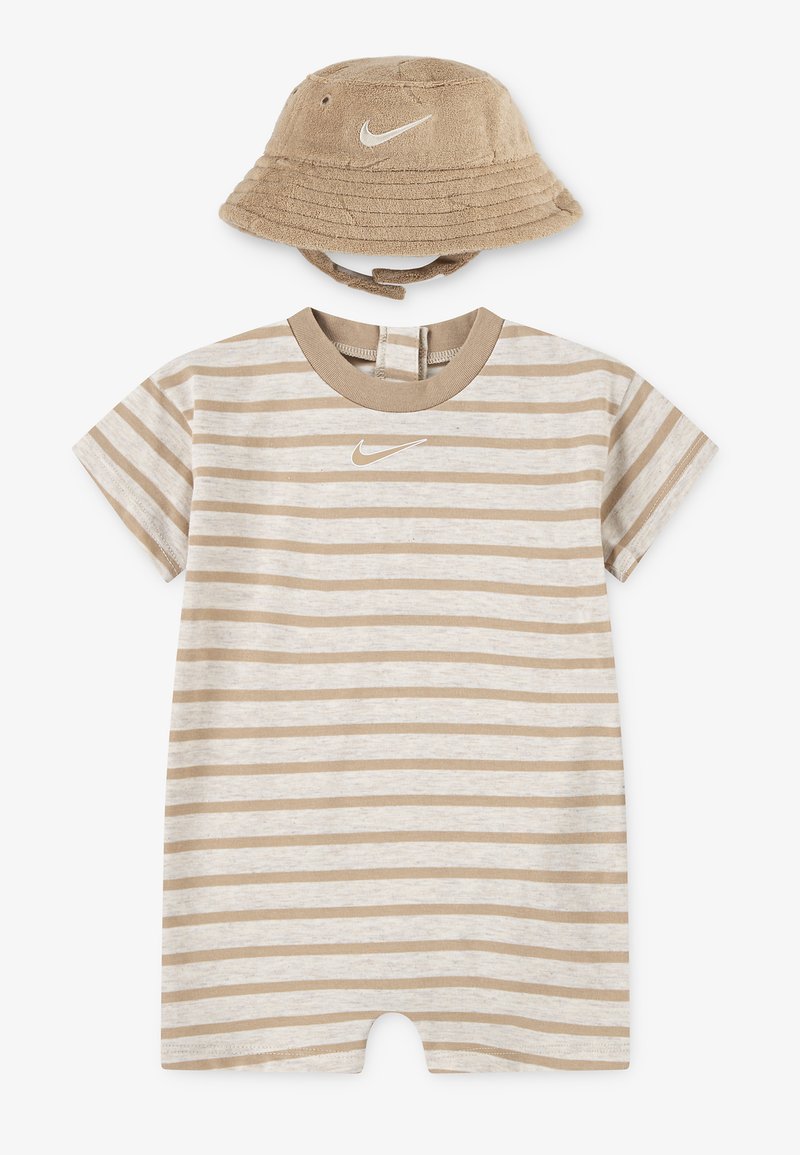 Beige and white striped short-sleeve romper with Nike logo and matching beige Nike bucket hat made of soft fabric.