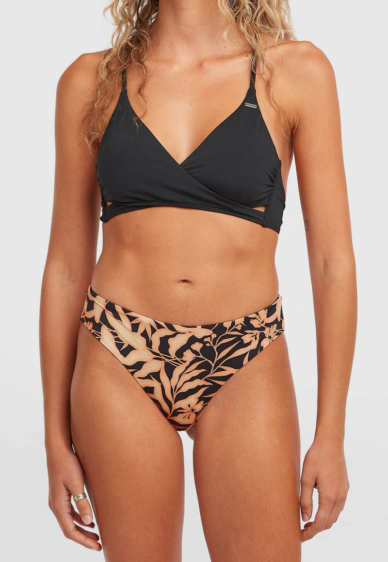 Woman wearing a black bikini top with thin straps and floral patterned bikini bottoms in peach and black.