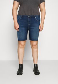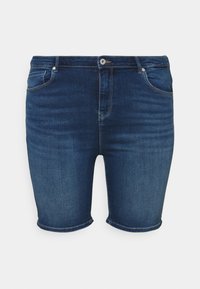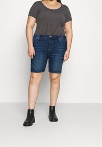 Blue denim shorts with a regular fit, five-pocket design, and a mid-rise waist, paired with black ankle boots and a gray shirt.