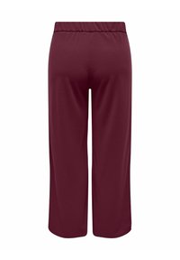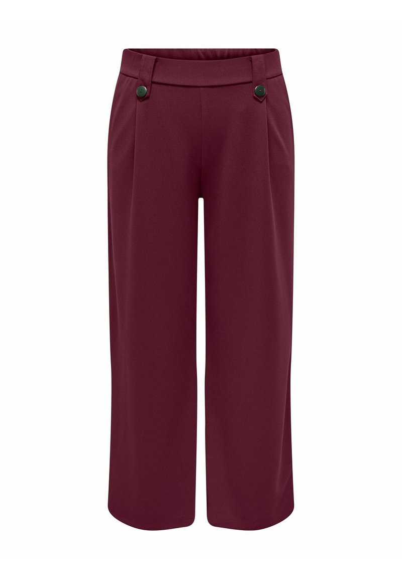 Wide-leg cropped burgundy pants with high waist and two black buttons at the front pockets on plain white background.