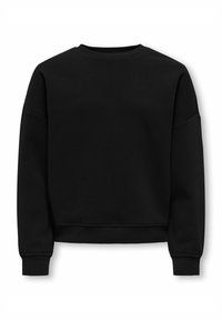 Light gray oversized sweatshirt with dropped shoulders and a round neckline, paired with loose blue denim jeans featuring large pockets.