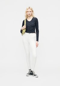 Blonde woman wearing a navy blue long-sleeve buttoned crop top with white polka dots and white high-waisted pants, standing against white background.