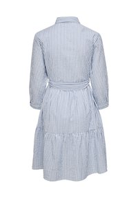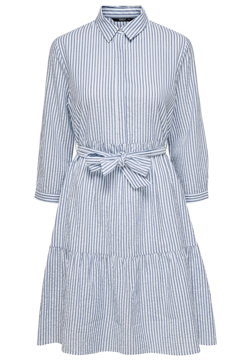 Shirt dress with blue and white vertical stripes, long sleeves, collar, and a tied belt at the waist above a gathered skirt.