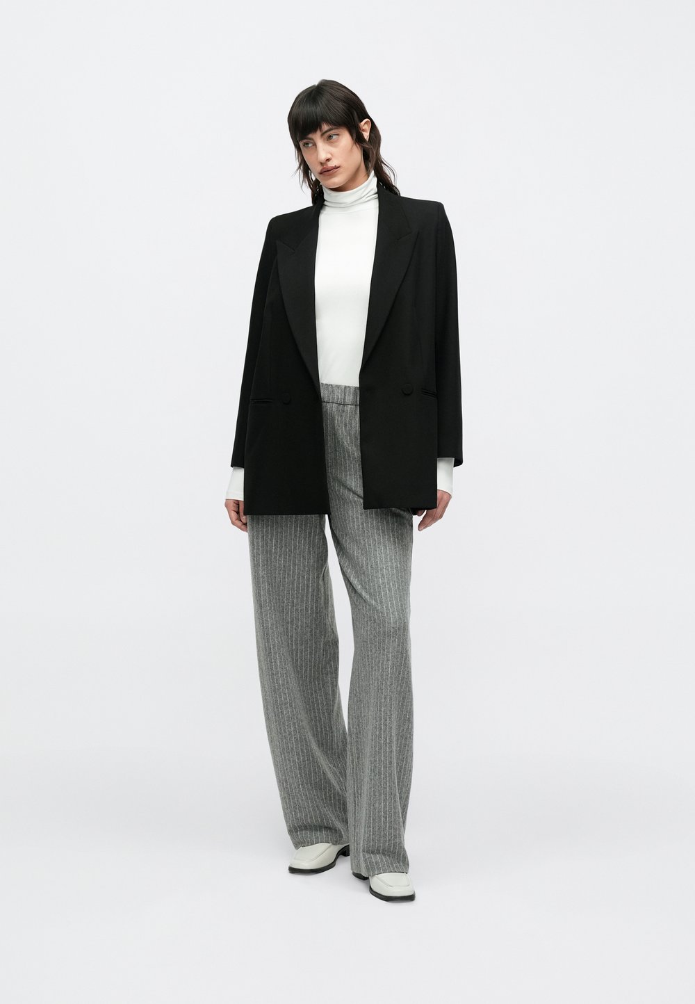 Black leather jacket, brown fitted top, grey wide-leg trousers, standing on stairs with a textured white wall behind. Silver necklace detail.