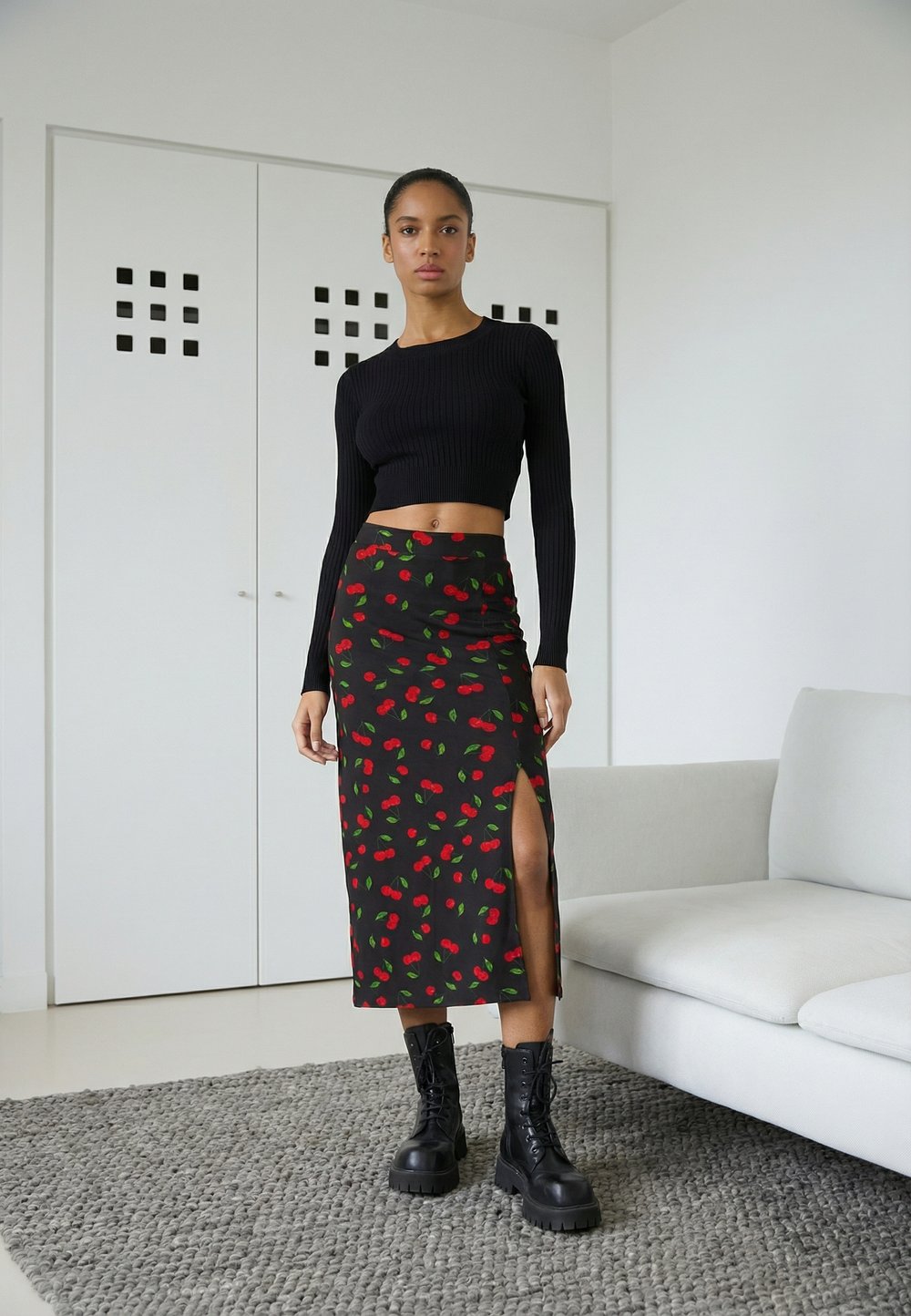 Black skirt featuring a red cherry pattern and a side slit, teamed with a black top and a red handbag. Grey sneakers complete the look, set against a backdrop of greenery and a brick wall.