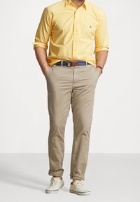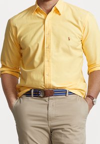 Man wearing a yellow button-up shirt with sleeves rolled up, beige pants, a blue striped belt, and a wristwatch, hands in pockets.