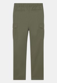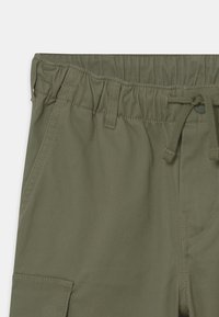 Olive green cargo pants with elastic waistband, drawstring, side pockets, and flap pockets on each thigh, straight leg fit.