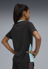 Black sports jersey with a textured pattern, light blue accents on the collar and sides, featuring Puma logo and "Olympique Marseille" emblem.