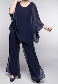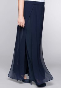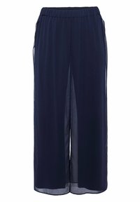 Woman wearing navy blue wide-leg sheer pants with elastic waistband, paired with dark shoes and a white top.