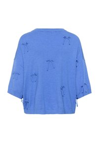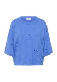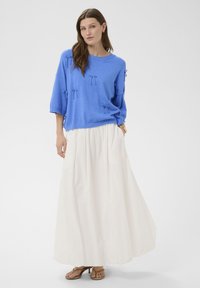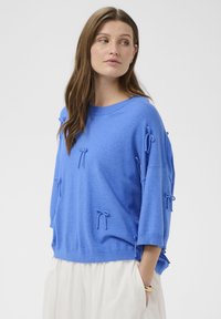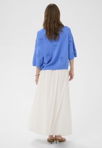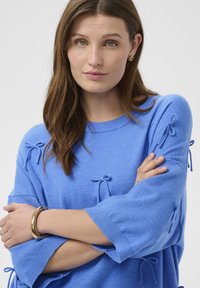 Woman wearing a loose blue sweater with small bow details and a white skirt, looking to her left against a plain background.
