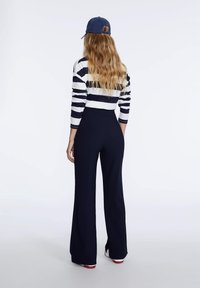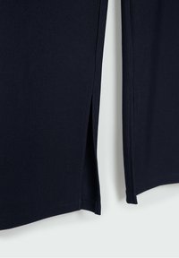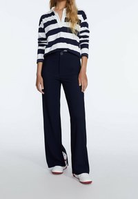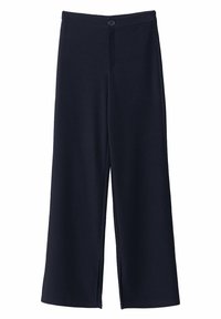 Navy blue wide-leg trousers in a smooth fabric with a front button closure. Features slits at the hem. Paired with white shoes with red accents.