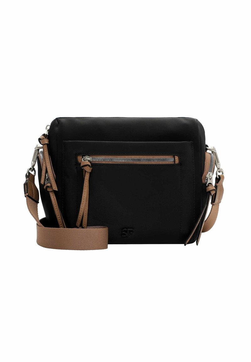 Black rectangular crossbody bag with brown adjustable strap, front zip pocket, and silver zipper details.