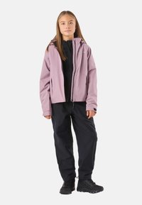 Young person standing, wearing a light purple hooded jacket, black pants, and black hiking shoes on a plain background.