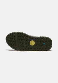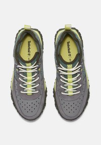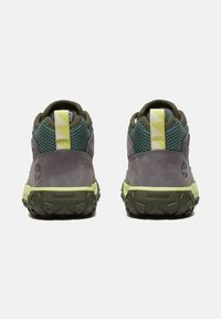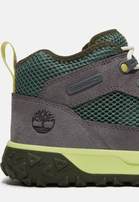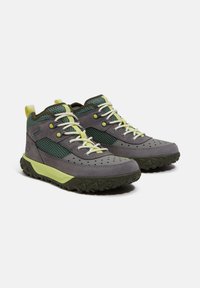 Gray and green hiking shoes with mesh accents, rubber sole, and contrasting lime green details. Features reinforced eyelets and pull tab.