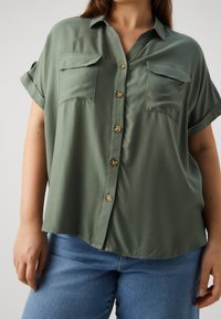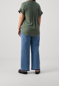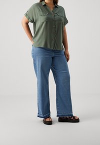 Person wearing an olive green button-up shirt with rolled short sleeves and two chest pockets, paired with blue jeans.