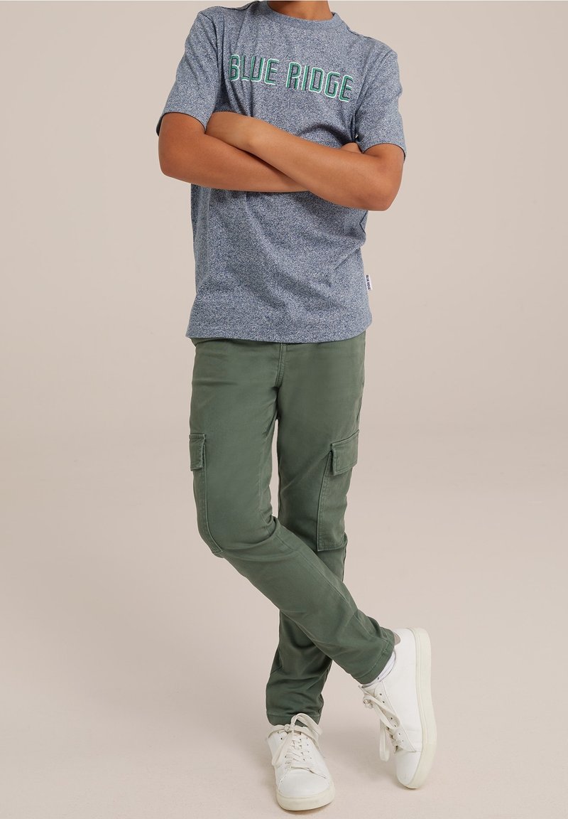 Boy in blue "Blue Ridge" t-shirt, olive cargo pants, and white sneakers standing with arms crossed and legs crossed on beige background.