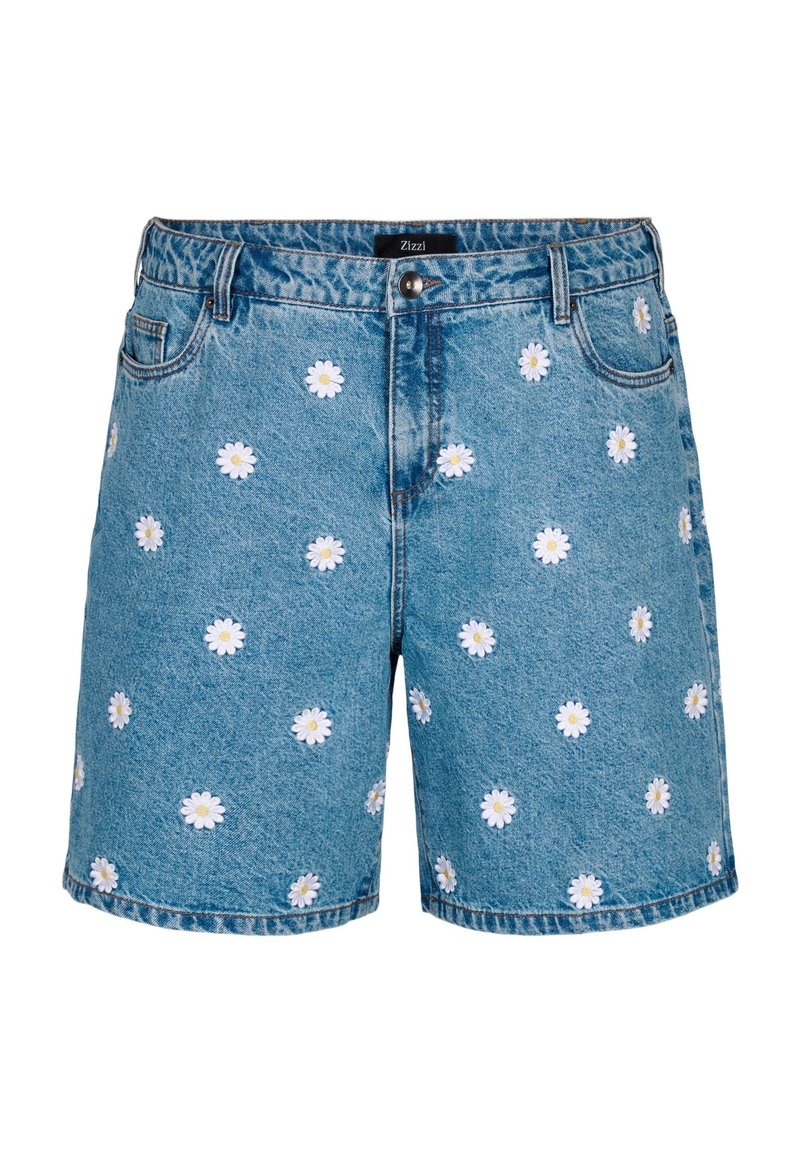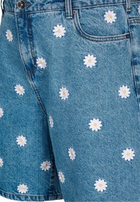 Denim shorts in light blue with white daisy embroidery, featuring a regular fit, front pockets, and a button closure at the waist.